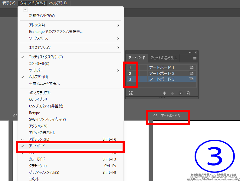 (※アートボードの番号は、アートボードパネルを開くと確認できるようになっています。また、イラレ2026ではアートボードの左上にも番号や名前が表示されており、確認できるようですね)