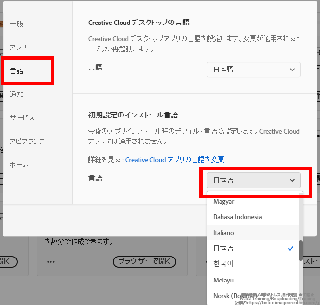 言語設定は、Adobe Creative Cloudの画面で変更するようです。